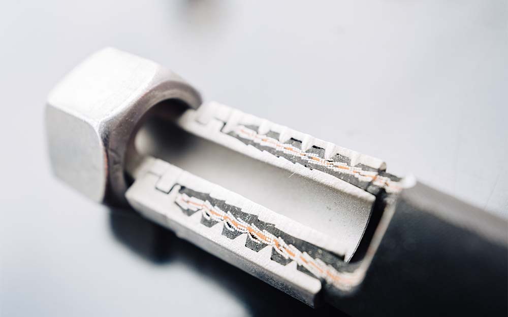To ensure a safe connection between hose and fitting under extreme loads and high pressures of up to 500 bar, interlock fittings can be used as a system solution with pull-out protection. The inner and outer layers of the hose are peeled to allow the crimp nipple to achieve a highly effective positive fit with the hose and the ferrule.