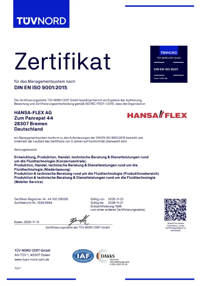 Als national und international geschätzter Hydraulik-Partner verfügt die HANSA‑FLEX AG über umfassend geprüfte Managementsysteme. Am 24. November 2025 hat der TÜV Nord unsere neuen Zertifikate übergeben: Die Re-Zertifizierung nach ISO 9001 Qualitätsmanagement, ISO 14001 Umweltmanagement und ISO 45001 Arbeitsschutzmanagement wurde erfolgreich abgeschlossen und erstmals um die ISO 50001 für Energiemanagement erweitert. Damit ist unser hoher Standard bis 2028 bestätigt. Darüber hinaus wird auch unsere Bonität seit Jahren durch die Creditreform auditiert und hervorragend bewertet.